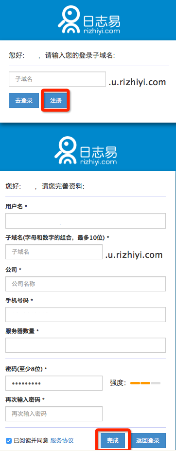 3. 点击“进入控制台”,会出现“登录”和“注册”界面,第一次使用请选择注册日志易帐号,按提示填入资料完成注册;如果已经注册日志易,请先输入二级域名,然后选择“去登录”: